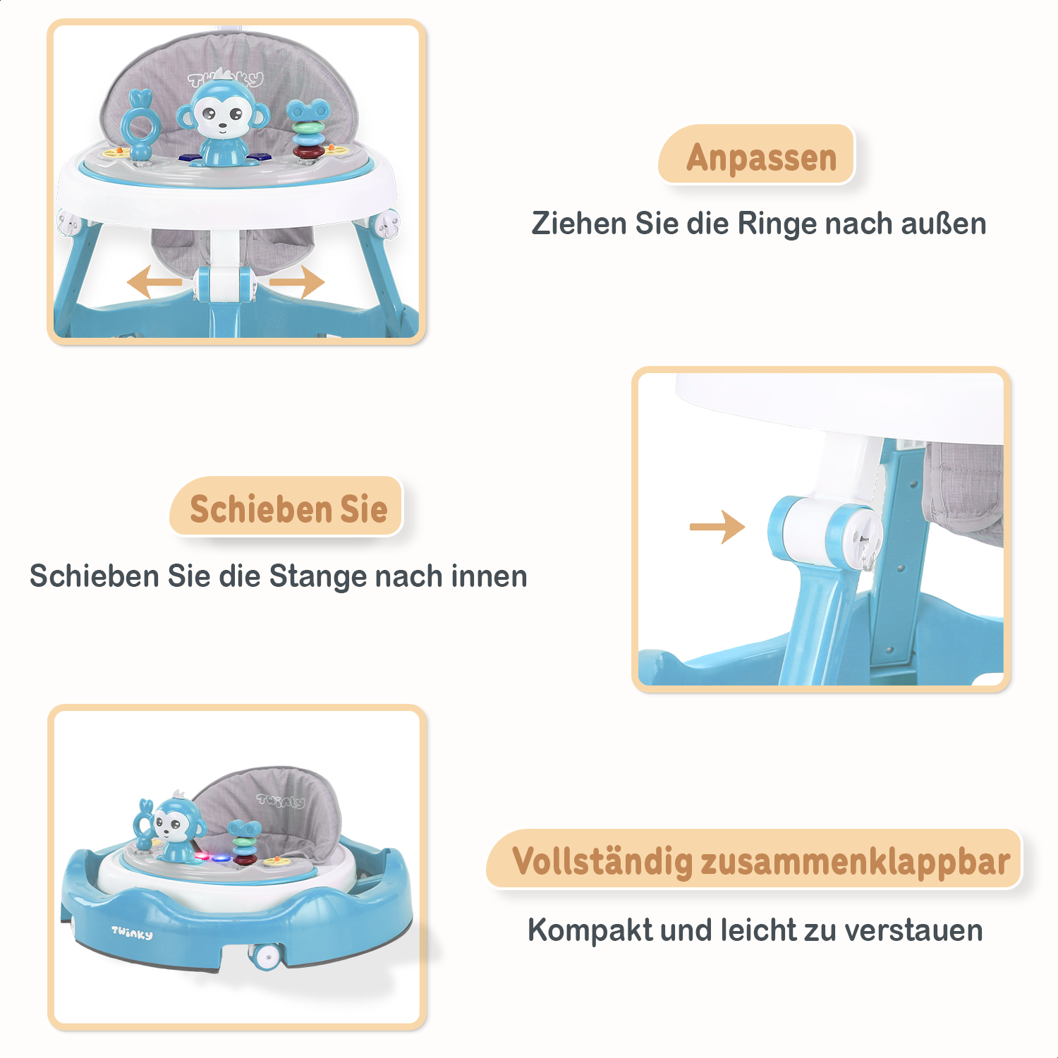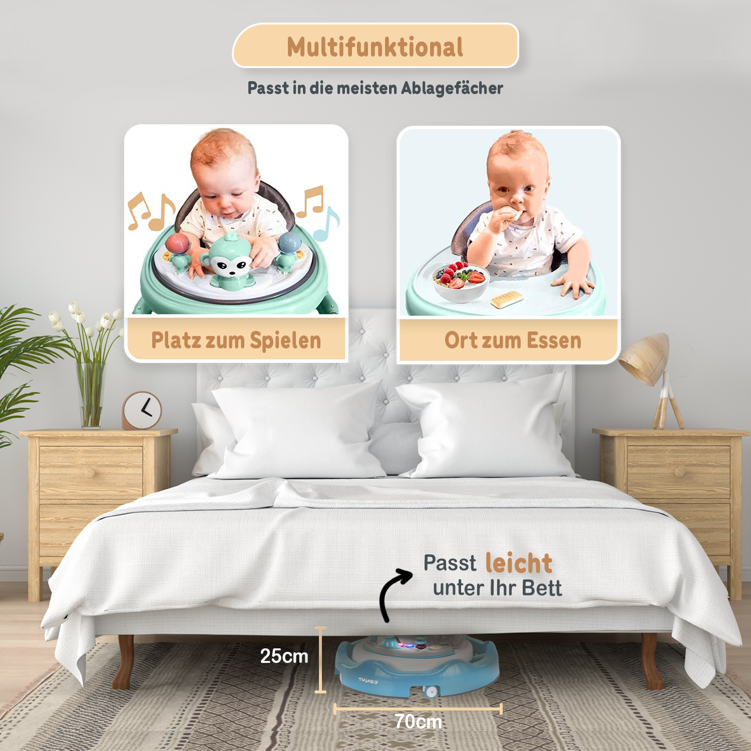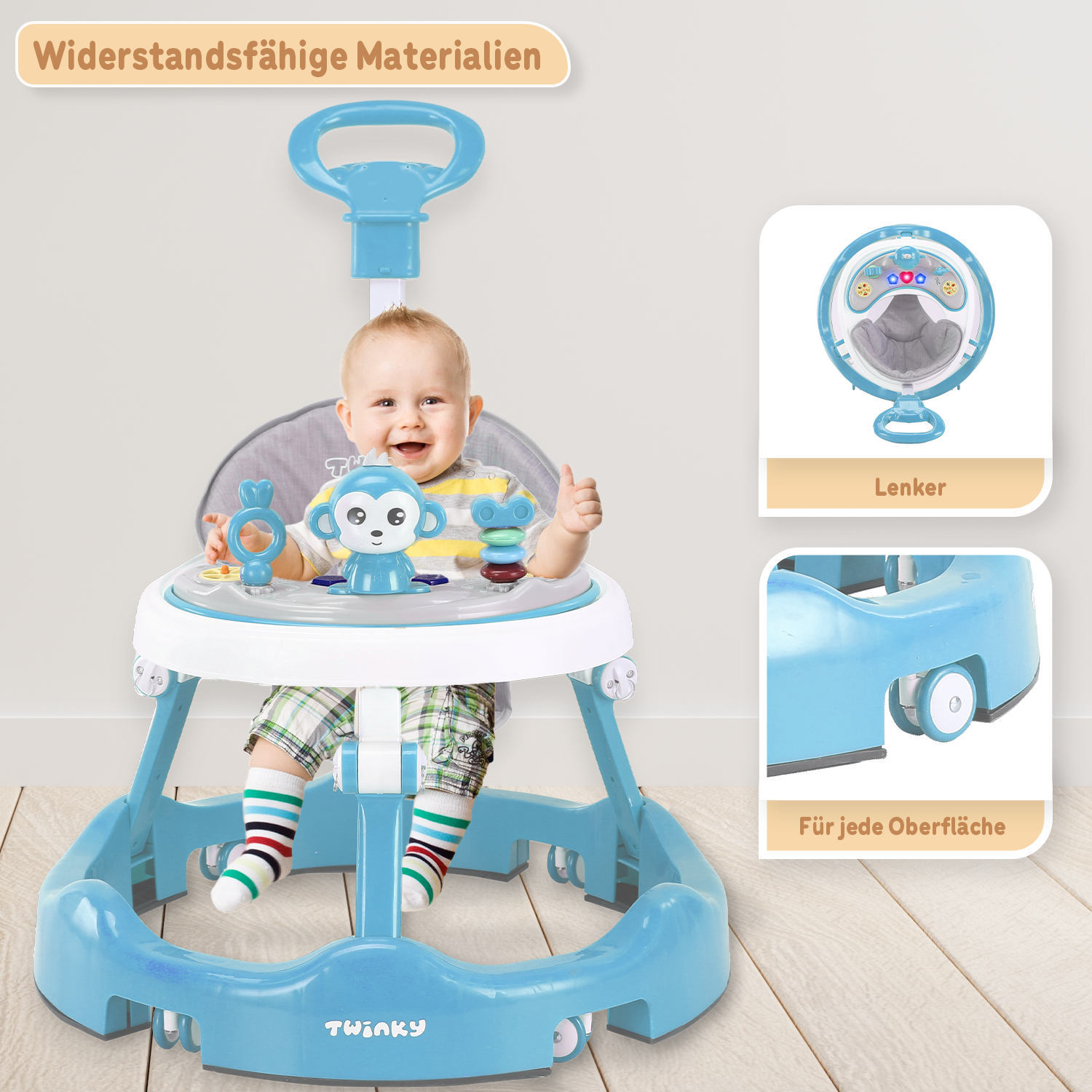 Obwohl der Twinky Babywalker mit Blick auf Sicherheit entwickelt wurde, ist Aufsicht immer ratsam. Achte darauf, dass sich dein Baby an einem sicheren Ort befindet und vermeide Treppen sowie gefährliche Bereiche.