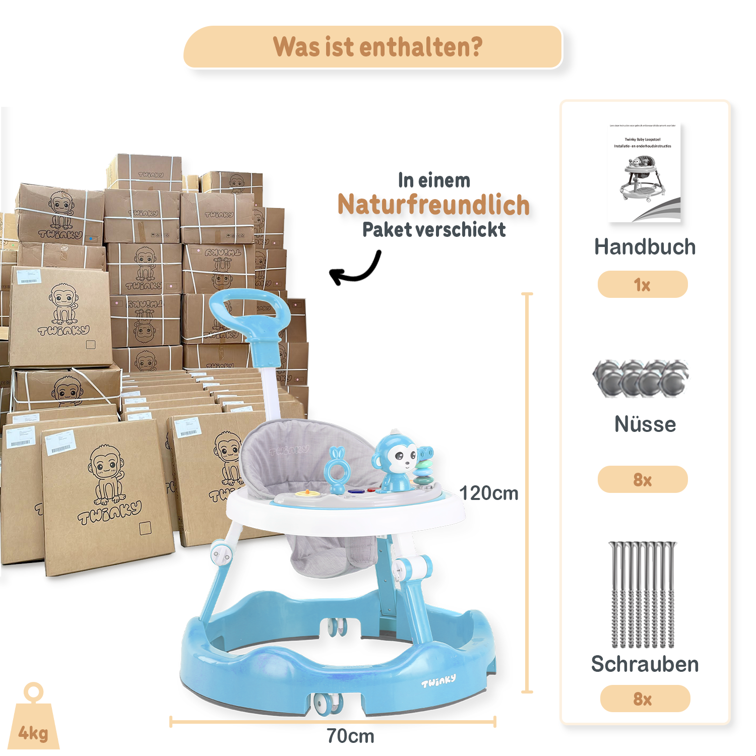 Der Twinky Babywalker wird sorgfältig verpackt und so schnell wie möglich zu dir nach Hause geliefert. Sobald deine Bestellung unterwegs ist, erhältst du eine Sendungsverfolgung per E-Mail.