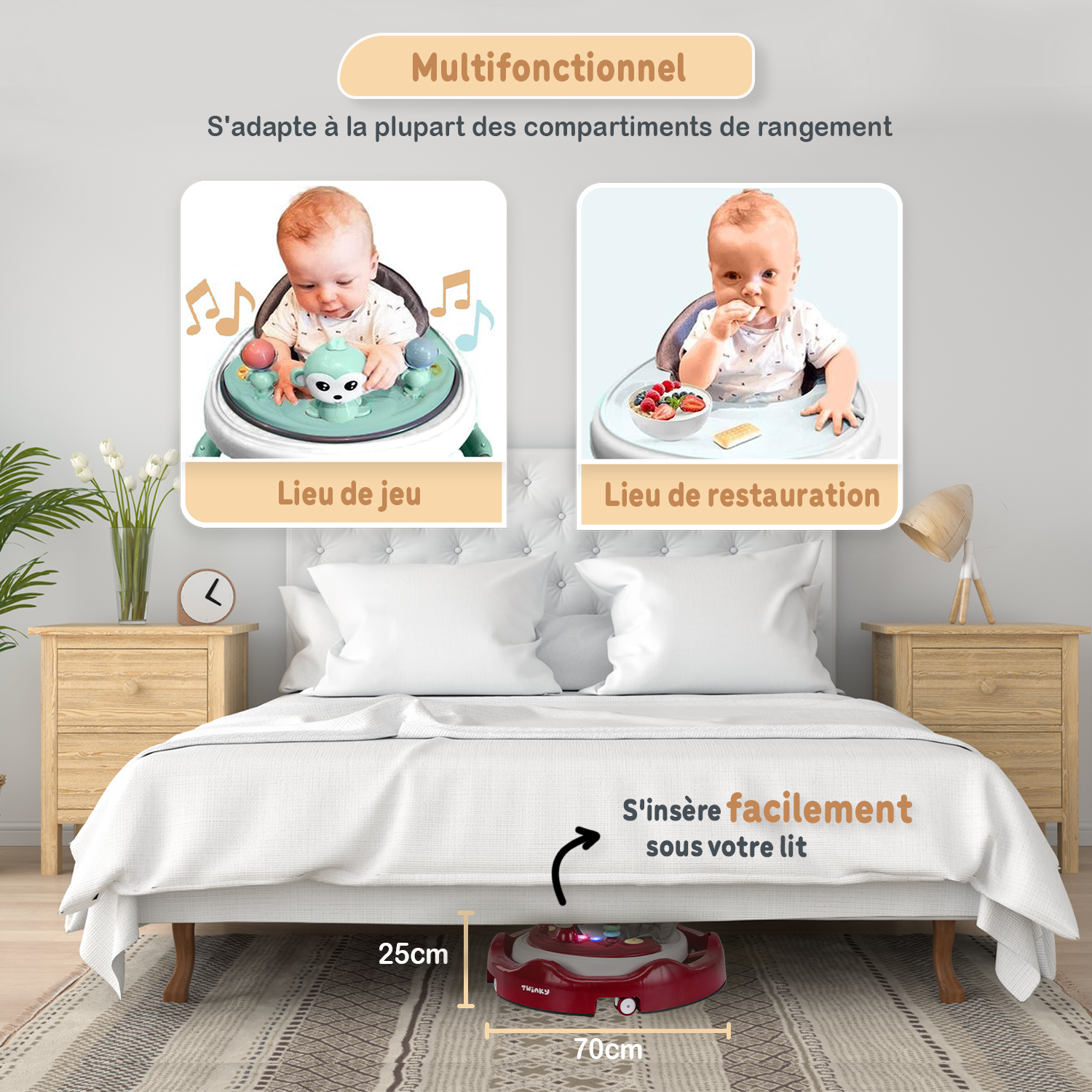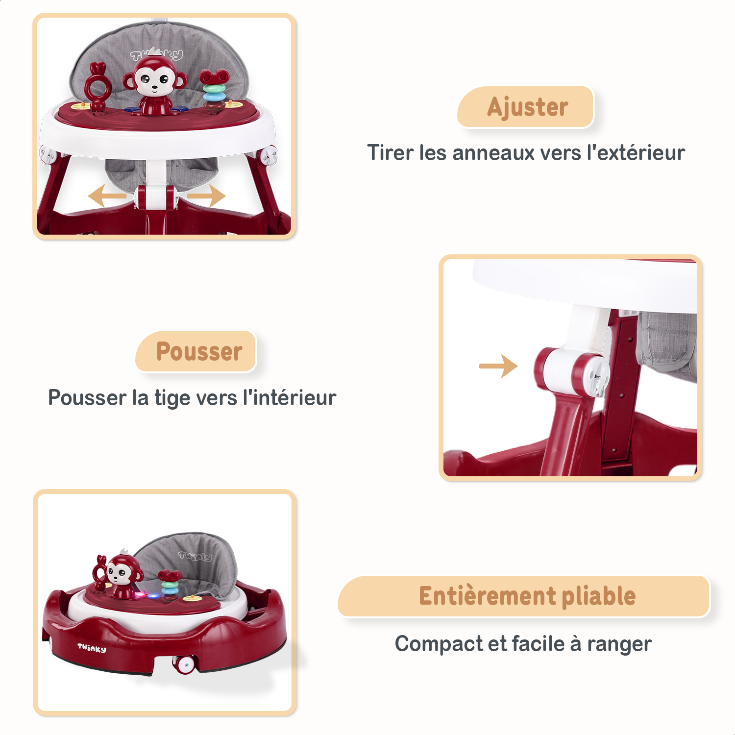 Une housse amovible et des matériaux résistants aux taches facilitent la vie des parents.Vous avez peur que la chaise haute entrave le passage ? Ce n’est pas le cas avec le trotteur Twinky ! Le trotteur pour bébé se plie très facilement, ce qui vous permet de lui trouver facilement une place. Pratique aussi à emporter en vacances ou chez la famille !