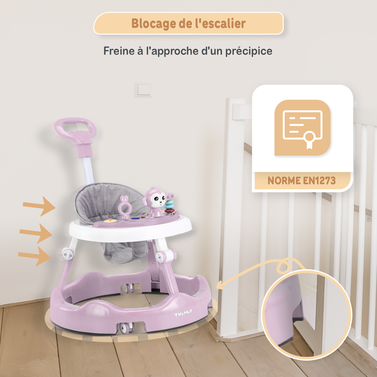 Bien que le Twinky Babywalker ait été conçu en pensant à la sécurité, une surveillance est toujours recommandée. Assurez-vous que votre bébé se trouve dans un endroit sûr et évitez les escaliers ainsi que les zones dangereuses.
